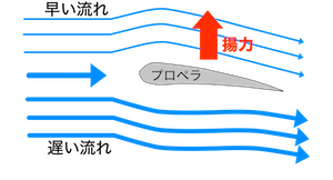 プロペラが回転するとプロペラの上下で空気の流れる速度が変化します。